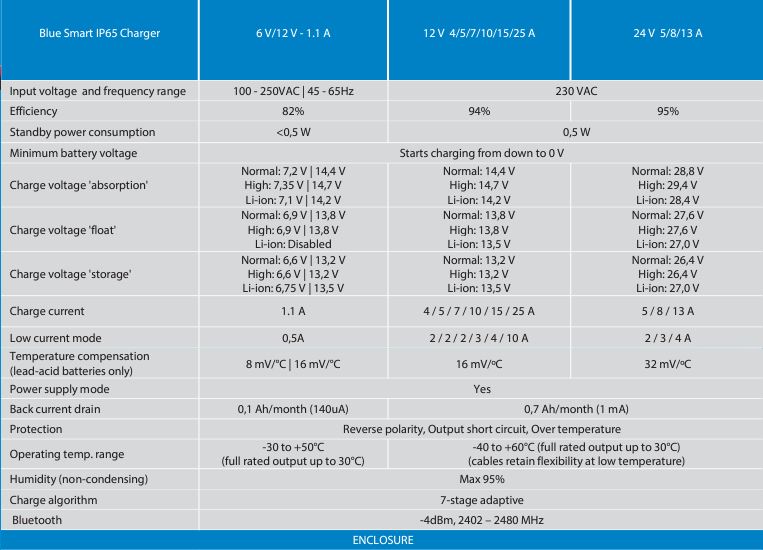 The Blue Smart IP65 Charger uses a specific charging algorithm for Li-ion (LiFePO₄) batteries, with automatic Li-ion under voltage protection reset.