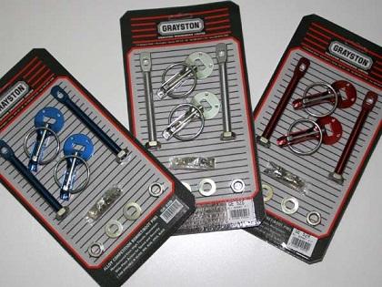 GRAYSTON Slide plate and pins manufactured from very strong lightweight high tensile aluminium. Used by most major works rally teams. Quick release slide action for securing bonnets, tailgates and boots.