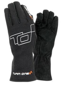 Turn One Basic race gloves, here in black. These gloves offer a level of fire resistance and protection that normal driving gloves don’t provide. These single layer Nomex gloves are suited to forms of motorsport or trackday events, where the expense or requirement for FIA Approved gloves isn’t required. They feature a single layer of Nomex fabric, with a padded goatskin palm, internal seams and an elastic wrist closure to keep them firmly in place. Available in a range of sizes to suit most wearers.