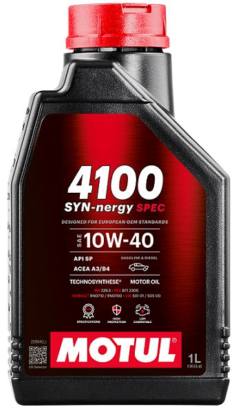 The Technosynthese® reinforced synthetic base of MOTUL 4100 SYN-nergy SPEC 10W-40 limits volatility, provides very high lubricating power which reduces friction and allows it to withstand the high temperatures reached in modern engines in order to perfectly meet many specifications constructor.