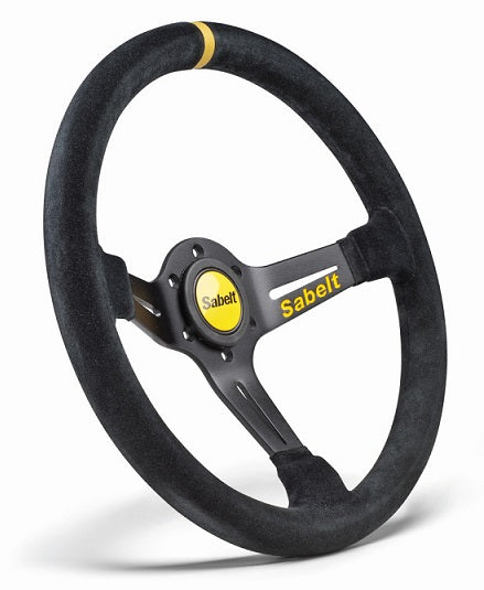 SABELT SW-465 steering wheel is a very traditional, semi dished 3 spoke, race and rally car steering wheel with a 350mm diameter. Finished in black suede and supplied complete with horn push button. Sabelt steering wheels feature stronger aluminium spokes than their competitors and a round handgrip section of 30mm diameter, with a 65mm depth dish.