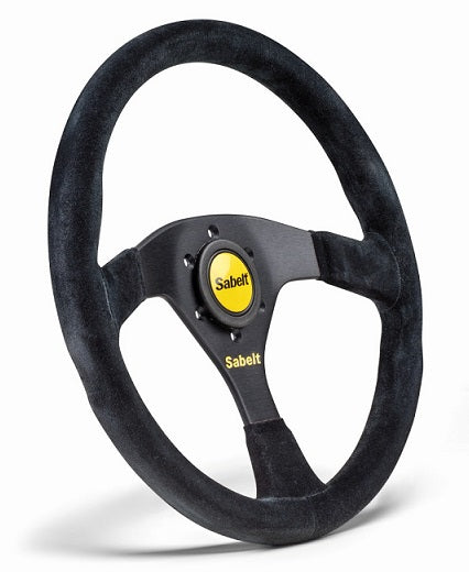SABELT SW-635 steering wheel, originally the Sabelt Monaco model. A traditional, 3 spoked, flat race and rally car steering wheel with a 350mm diameter. Finished in black suede and supplied complete with horn push button. SABELT steering wheels feature stronger aluminium spokes than their competitors and a round handgrip section of 30mm diameter.